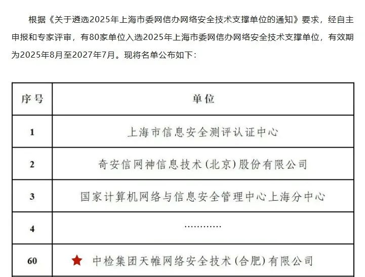 近日,上海市委网络安全和信息化委员会办公室(以下简称“上海市委网信办”)公布了2025年上海市委网信办网络安全技术支撑单位名单。中检天帷凭借出色的技术和全链条的网络数据安全合规治理能力成功入选。