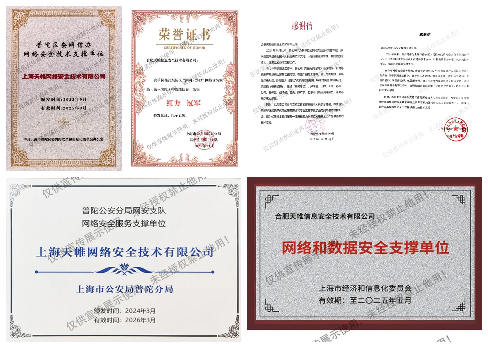 作为国内领先的网络数据安全合规治理解决方案服务商,中检天帷始终以科技创新为核心驱动,不断加强研发和服务团队建设,形成了以等保测评为核心,覆盖12大网络安全领域的合规治理服务体系。凭借深厚的行业积累、自主研发的网数安全合规治理平台以及覆盖全领域的合规服务能力,中检天帷自进入上海市场以来,通过持续的优质服务和良好的市场口碑,接连入选上海市经济和信息化委员会、普陀区委网信办、普陀区公安分局网安支队等多家网络安全服务应急技术支撑单位,并在历年攻防演练中多次荣获佳绩。