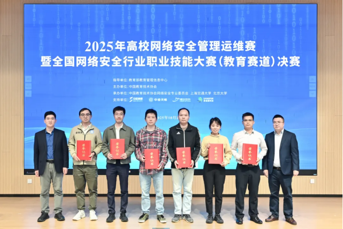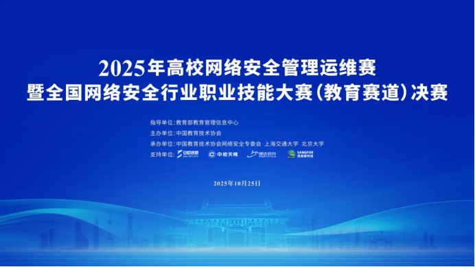 10月25日,由教育部教育管理信息中心指导、中国教育技术协会主办,中国教育技术协会网络安全专业委员会、上海交通大学、北京大学共同承办的“2025年高校网络安全管理运维赛暨全国网络安全行业职业技能大赛(教育赛道)决赛”在上海交通大学闵行校区顺利举行。作为大赛的重要支持单位,中检天帷积极参与赛事组织与保障工作,为大赛顺利开展提供了有力支持,并受邀参加颁奖仪式。