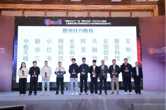 近日,上海市通信管理局联合市委网信办、市经信委、市公安局、市教委、普陀区人民政府和长兴岛管委会共同组织召开“铸网2025”暨“磐石行动”2025年上海市工业和信息化领域网络安全实战攻防活动总结大会,通报总结攻防成果并为优秀单位颁奖。中检天帷凭借出色的技术、体系化的攻防能力和稳定高效的团队表现,荣获“优秀红方队伍”和“突出进步奖”两项荣誉。