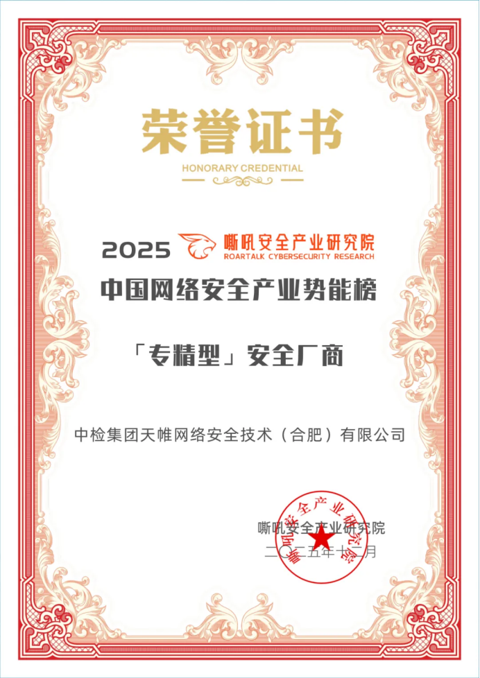 - [ 2025-12-10 ] 中检天帷荣获嘶吼2025网络安全“金帽子”奖并入选产业势能榜专精型企业