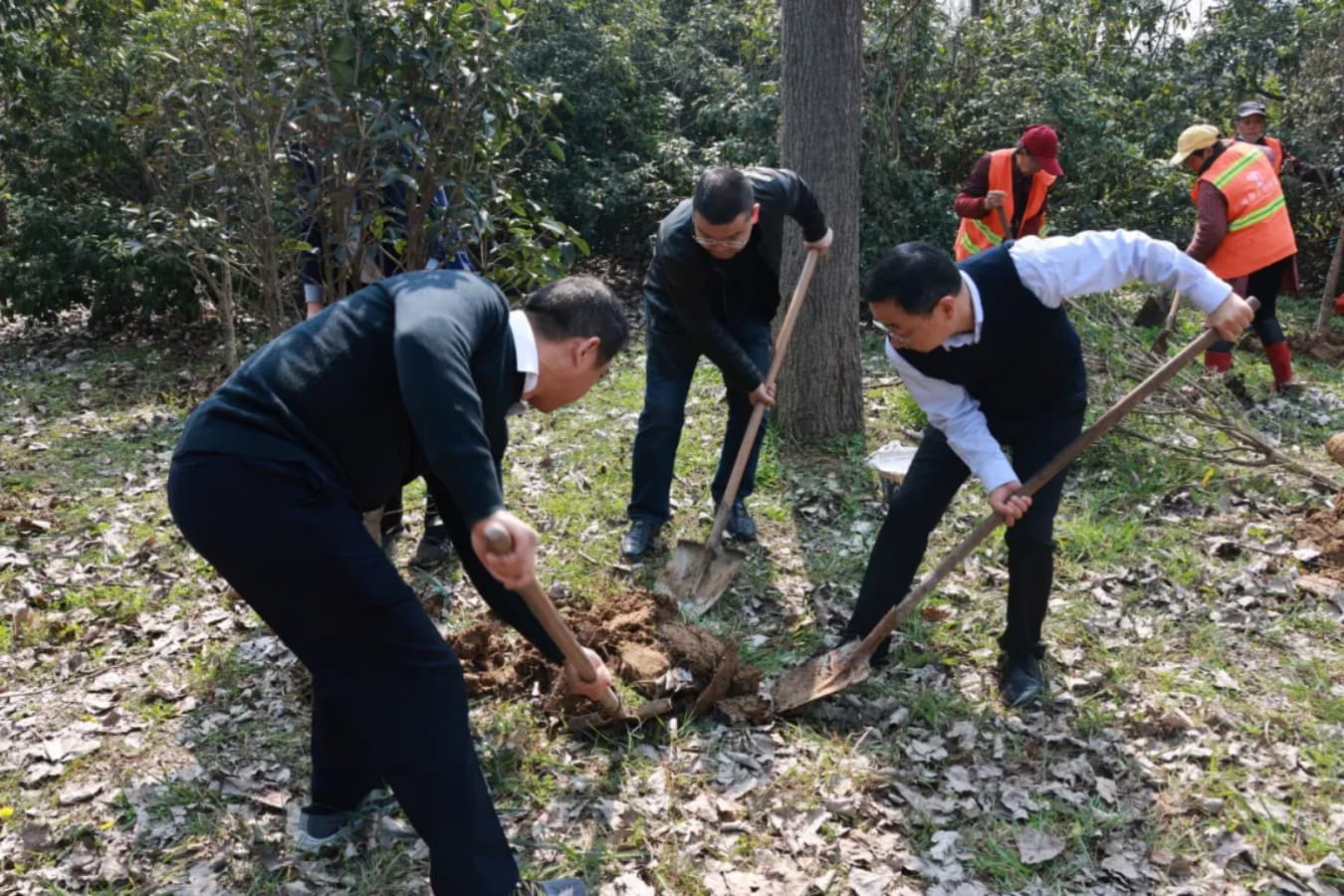 活动现场,大家分工协作、干劲十足。挥锹铲土挖树坑、扶正树苗定根基、培土围堰固根系、提桶浇灌润新芽……每一道工序都一丝不苟。经过一番辛勤劳作,一株株株桂花幼苗整齐挺立,在春风中舒展枝叶,承载着大家对绿色未来的期许,更寄托着中检天帷主动担当社会责任、助力美丽中国建设的使命初心。