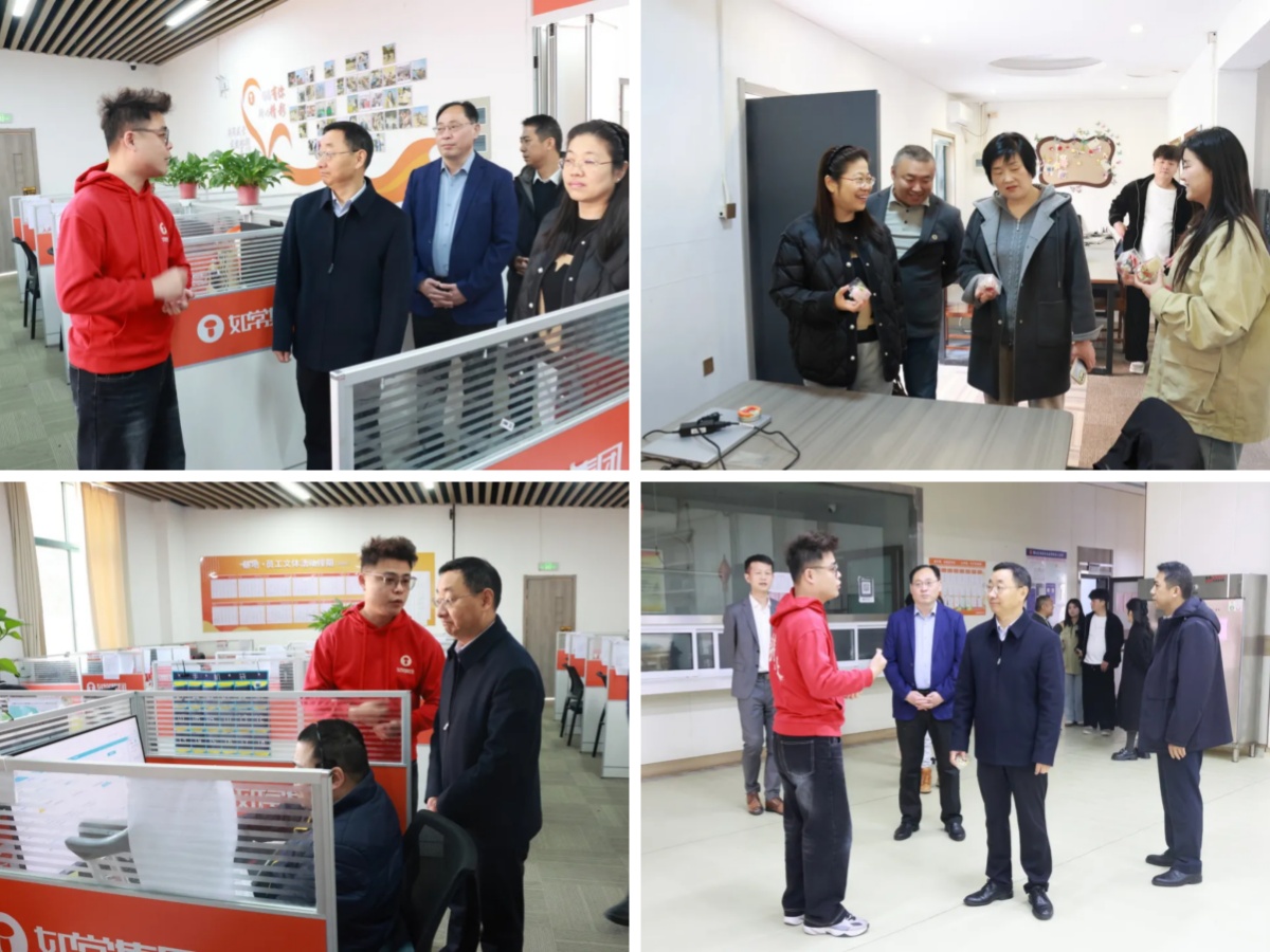 在残疾人就业基地,中检天帷总经理胡兴元、工会主席张明哲等先后参观了数据标注职场区、接听客服职场区、辅助性就业车间、成果展示区、员工食堂及宿舍等功能区域,通过现场察看、细致询问,并与基地负责人、残疾学员及在岗职工亲切交流,全面了解基地在科技赋能残疾人就业、生活保障、技能培训等方面的创新模式与管理机制。
