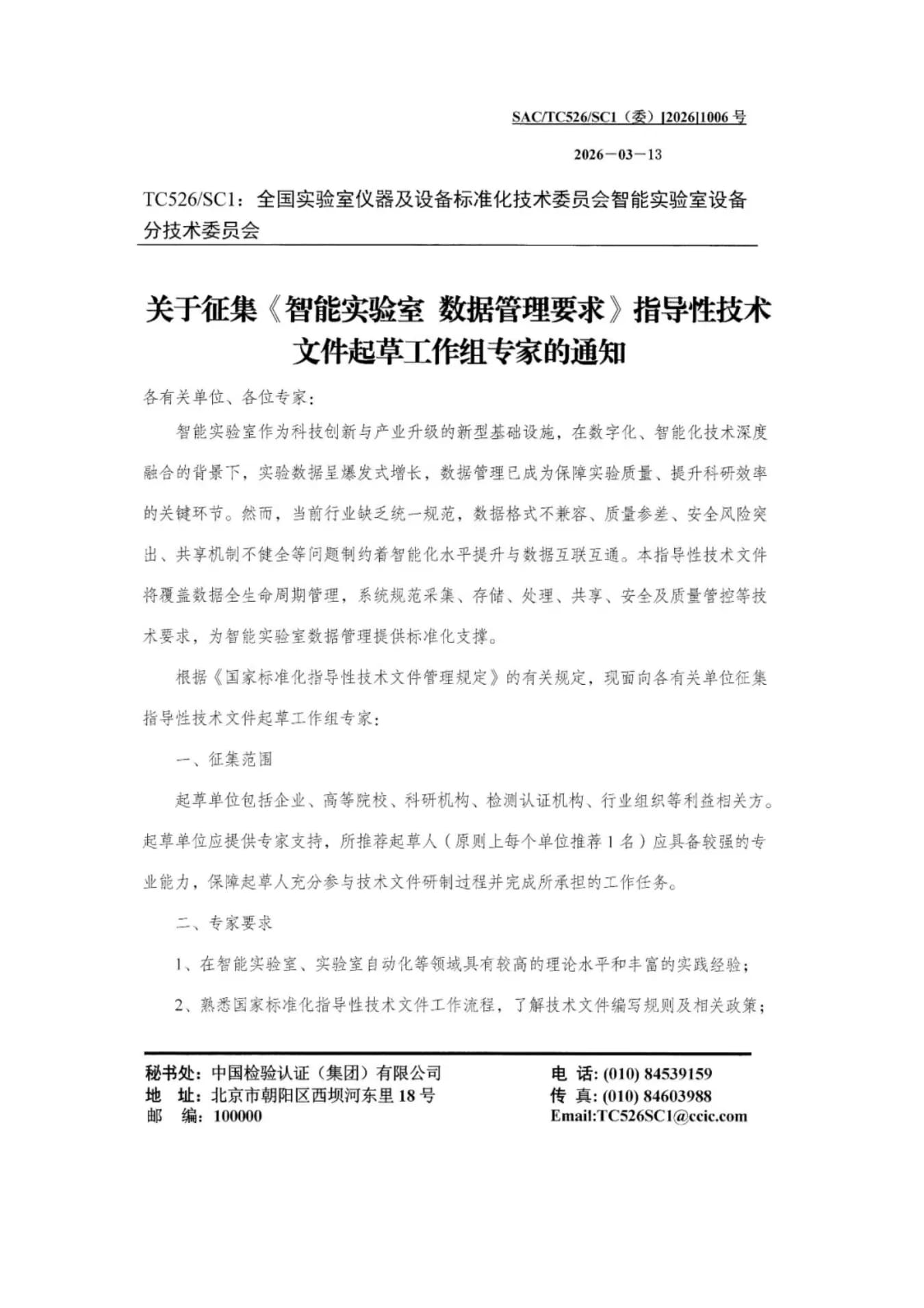关于征集《智能实验室 数据管理要求》指导性技术文件起草工作组专家的通知