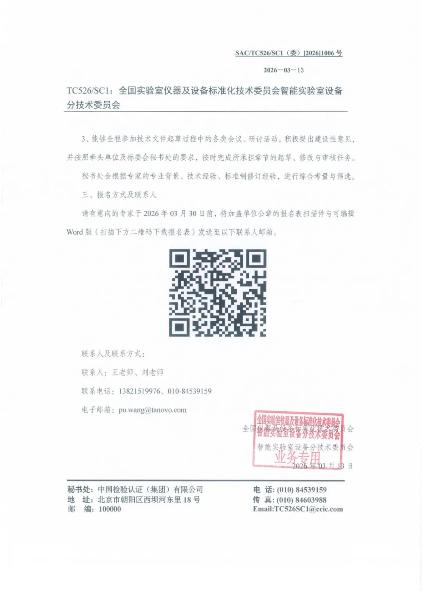 请有意向的专家于2026年3月30日前,将加盖单位公章的报名表扫描件与可编辑Word版(扫描下方二维码下载报名表)发送至以下联系人邮箱。